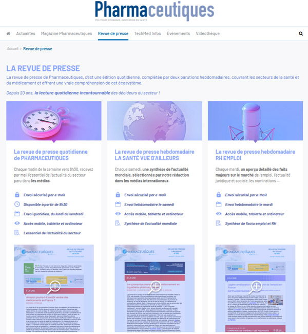 Tous les jours, la rédaction de Pharmaceutiques réalise une revue de presse complète de l’actualité des secteurs de la santé et du médicament. Cette analyse est effectuée grâce à la lecture de plus de 60 publications professionnelles, nationales et internationales (journaux, magazines et sites internet) et complétée par une sélection des informations les plus pertinentes issues des réseaux sociaux.